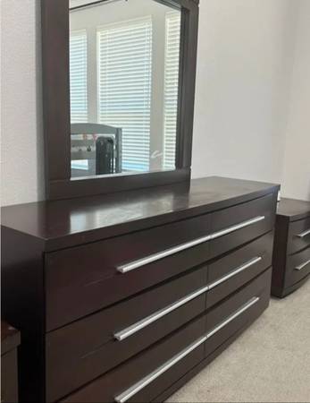 Everything is that rich espresso brown color with sleek silver handles. Very clean lines, feels fancy but not old-fashioned. No scratches, no damage. gently used and ready for your room