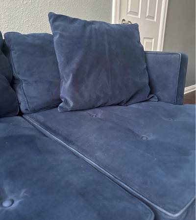 Well loved but still in decent condition. Gorgeous navy blue color, and super comfy cushions with tufting detail.