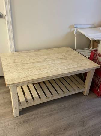 Solid wood coffee table with distressed white paint finish. Including a shelf. Great condition. Pick-up only.