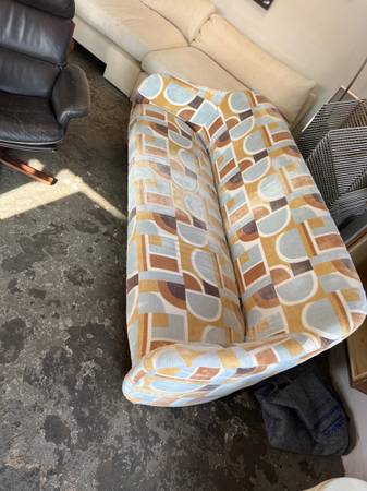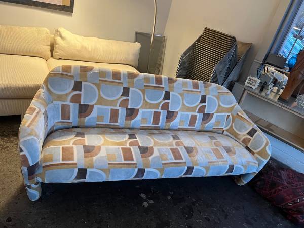 I am selling this awesome couch in the best upholstery ever! The chocolate, butterscotch and baby blue tones are soooo on trend. The modern lines seal the deal and it’s actually comfortable. 80...