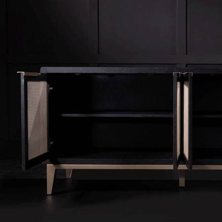 - Rich onyx wood finish with gold hardware and four cane-panel doors