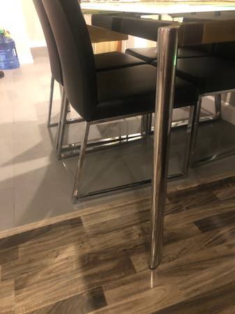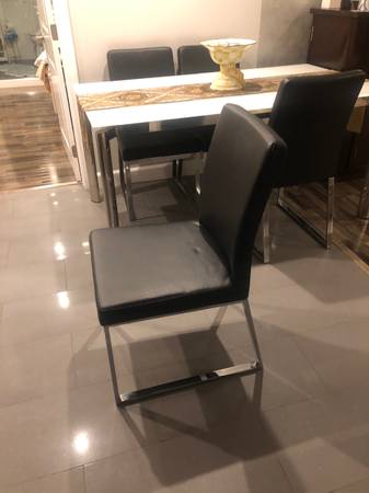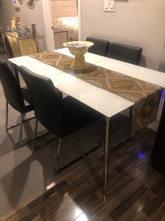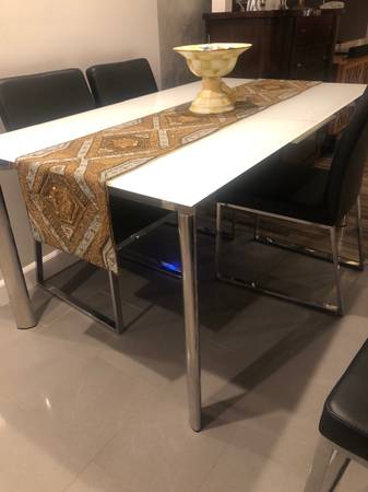 This table and chairs are as good as new, in excellent condition, practically looking like it has been just bought!! The table in white tempered glass top and chrome sturdy base. White Tempered Glass Top, and Polished Stainless Steel Legs,