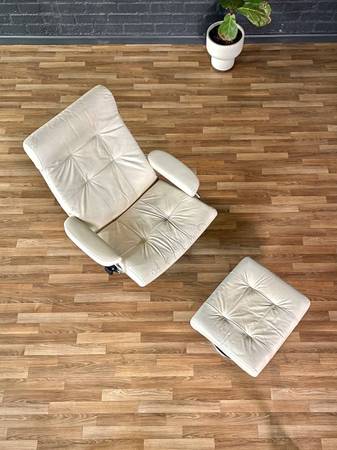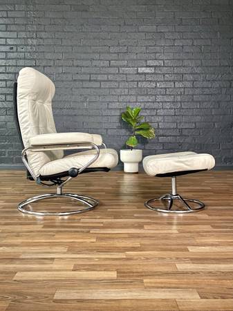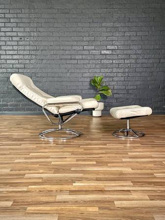 Experience unmatched Scandinavian comfort with this vintage Ekornes Stressless reclining lounge chair and ottoman, crafted in Norway during the 1970s. Upholstered in supple beige leather, the chair is supported by sleek chrome bases that swivel effortlessly to match your preferred angle. The ergonomic design and plush cushioning offer a luxurious seating experience that has become synonymous with the Stressless name. Please note some visible wear on the seat, including crackling in the leather, consistent with age and use (see close-up image for detail). A true icon of Post Modern design, this set brings both functionality and timeless elegance to any interior.