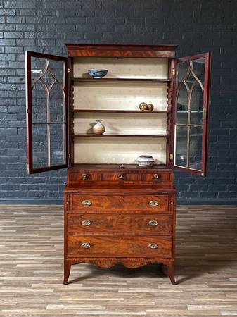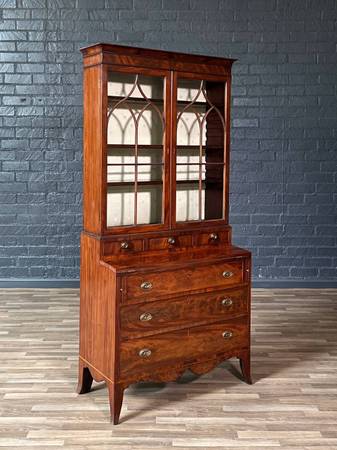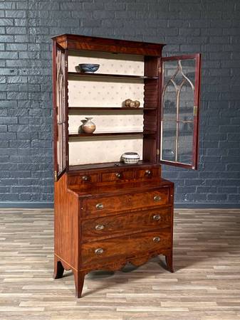 English Georgian Sheraton Style Flame Mahogany Secretary Bookcase, c.1900’s