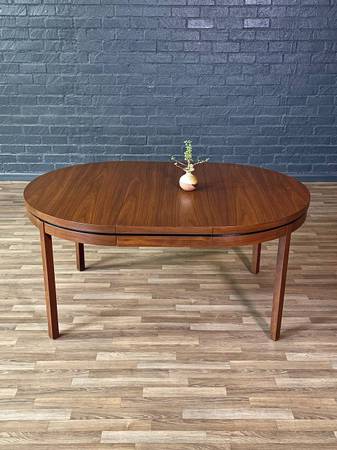 This expanding walnut dining table was designed by Merton Gershun in the 1960s and produced by the Dillingham Furniture Company in the 1970s, as marked underneath. Part of the sought-after “Esprit” collection, the table reflects Gershun’s signature blend of clean modern lines with functional versatility. Its round profile extends into an oval with ease, making it a perfect solution for both intimate settings and larger gatherings. Recently refinished by hand, the rich walnut grain now glows with warmth and depth, giving this table both a striking presence and lasting durability.