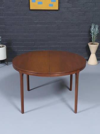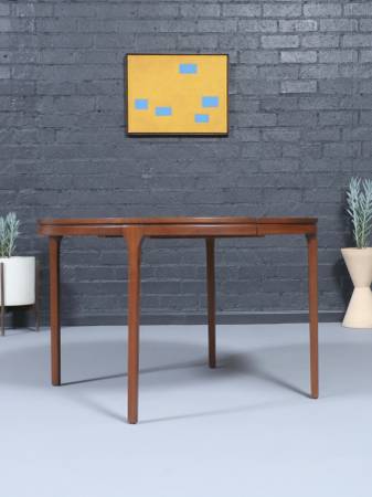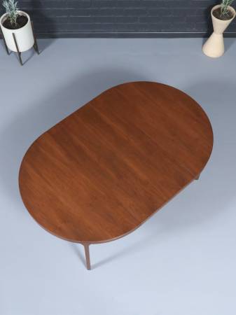 This expanding Mid-Century Modern walnut dining table showcases a beautifully refinished surface that highlights the depth and warmth of the natural grain. Its elegantly tapered legs and softly rounded edges give the piece a light, sculptural presence typical of 1960s American design. The hidden expansion mechanism allows the table to transition effortlessly from a round to an oval form, offering versatility for both intimate settings and larger gatherings. Expertly refinished, the table is smooth to the touch with a rich, consistent tone throughout. A timeless statement piece, it blends craftsmanship and functionality in a way that feels both classic and contemporary.