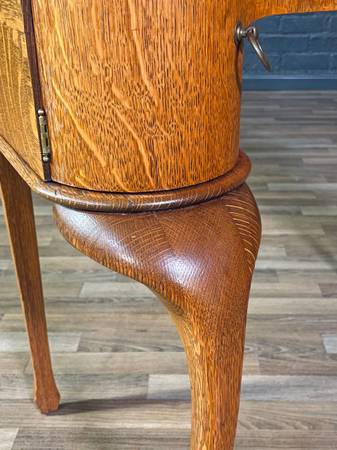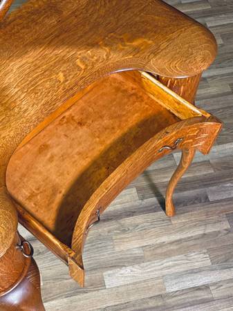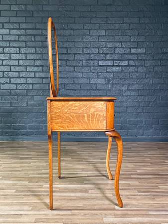 Fun Historical Fact: The heart-shaped mirror reflects a playful twist on classic Art Nouveau design, which often drew inspiration from nature, movement, and the soft curvature of the human form. By the 1920s, American artisans were blending French stylistic influences with local materials like tiger oak to create unique interpretations of European decorative arts. Dressing desks like this were considered luxury pieces of their era, often given as cherished gifts for weddings, anniversaries, or coming-of-age celebrations.