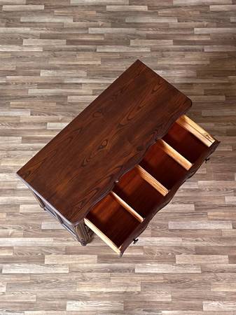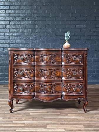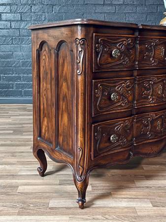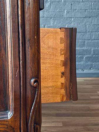 Henredon’s Four Centuries collection from the 1960s was designed to capture the romance of European furniture, and this dresser is a beautiful example of that vision. Crafted in the French Louis XV style, it features ornate carvings, a scalloped apron, and graceful cabriole legs that embody the elegance of the Provincial tradition. The case is built from richly grained tiger oak with a warm walnut-toned finish, giving depth and richness to the flowing drawer fronts. Original brass pulls highlight the floral and scroll motifs, while the solid oak construction and dovetail joinery reflect Henredon’s reputation for quality craftsmanship. Preserved in its original vintage condition, this dresser balances decorative artistry with everyday function, making it as practical as it is timeless.