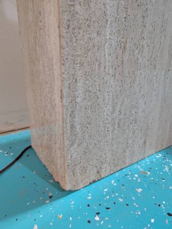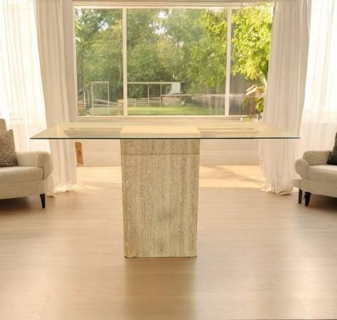 Italian Artedi Travertine Glass Console table. It is a vintage 1970s narrow console table consisting of a travertine rectangular base and a glass top, which is not the original glass. The top is supported by a pair of brass stretchers which are embedded in the travertine base.