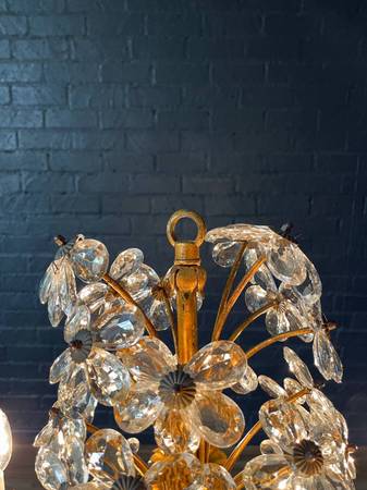 This Italian gilt tole candelabra lamp is a dazzling example of Rococo-inspired design, crafted in Italy during the 1950s. Featuring a lavish arrangement of faceted crystal flowers and teardrop prisms, the lamp captures the ornate elegance and romantic flair of old-world European decor. The gilt finish, sculptural floral arms, and classical base reflect the traditional craftsmanship associated with Italian tolework. Retaining its original electrical wiring, this piece functions both as a statement lamp and a decorative sculpture.