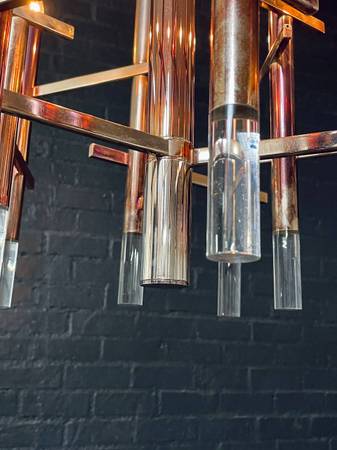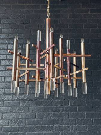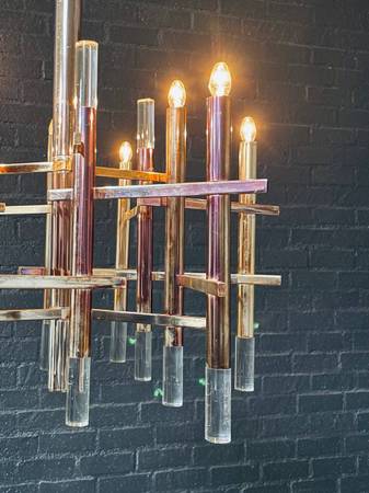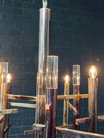 A striking example of Italian modernist design, this Mid-Century Modern chandelier by Gaetano Sciolari features a dynamic composition of patinated chrome rods intersected by horizontal supports, each topped with Lucite accents and warm candle-style bulbs. The bold architectural form gives the piece a sculptural quality, creating visual depth and elegance from every angle. Its polished chrome has developed a rich patina over time, enhancing its vintage character while pairing beautifully with the Lucite’s clean, translucent finish. This chandelier remains fully functional, casting a warm, inviting glow that elevates any space. A true collectible from the 1960s, it captures Sciolari’s visionary blend of glamour, geometry, and light.