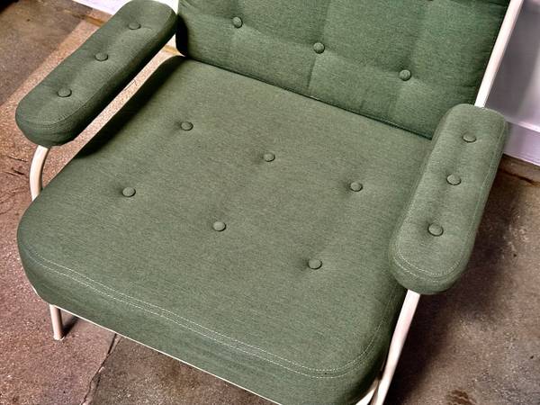 Green upholstery with white powder coat metal legs and black straps on the back. In excellent condition, has not been used very often.