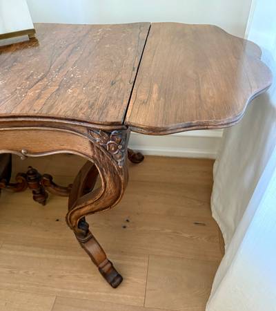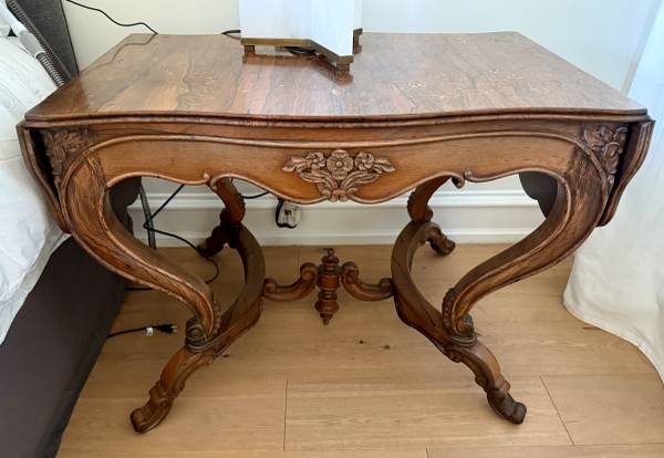 This is a functional, decorative table with drop sides. A piece of MGM History and came from the MGM Set Decorating Department (see photo from bottom). Some water markings on top, but otherwise in sturdy, great condition. Both sides fold down to make it larger/smaller.