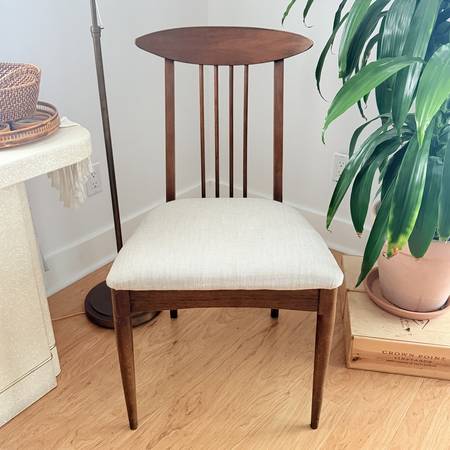 Single Mid-Century Broyhill Sculptra Dining Chair, Circa 1960s. This iconic, solid walnut chair features a sculpturally carved floating cat eye seat back back and cleanly tapered legs. The seat has been newly upholstered in a flax linen. It is sturdy, solid and in excellent vintage condition.