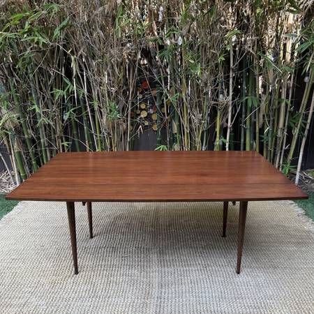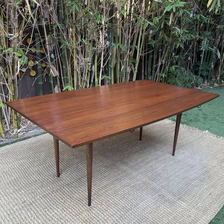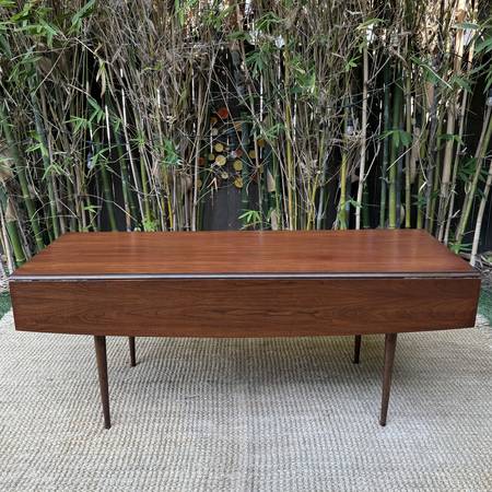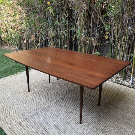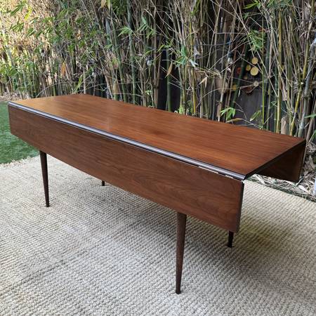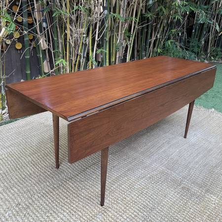 For sale is a stunning Mid-Century Broyhill Sculptra Harvest Dining Table (model # 6095-43), circa 1960s. This versatile walnut table converts from a gorgeous 8 seater dining table to a buffet/serving table depending on the needs of your gathering, allowing space to mingle or space to serve. The conical, tapered leges are inset from the tables edge so the full circumference can be used for seating without interference from the leg position. The drop leaves feature a subtle curved boat shaped edge and pull out on rigid metal brackets for a rock-solid conversion. It is sturdy, solid, and in excellent vintage condition.