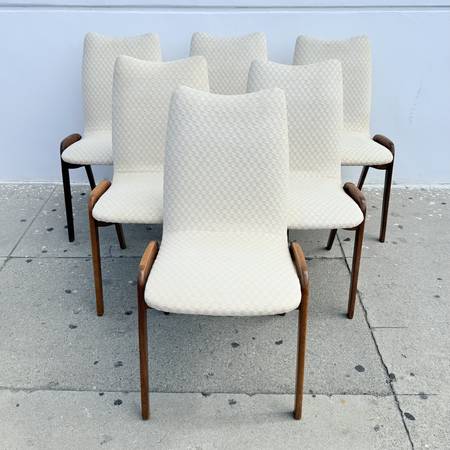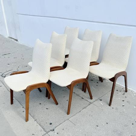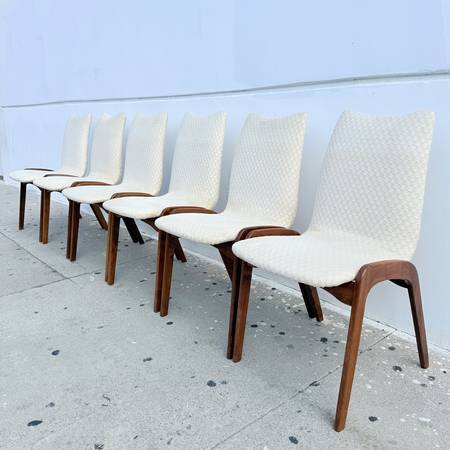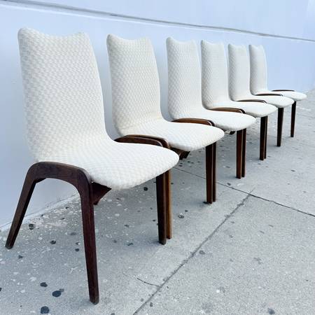 For sale is a stunning set of 6 Mid-Century Atomic Dining Chairs by Chet Beardsley, circa 1950s. These classic vintage chairs feature floated walnut legs with an organic curve supporting a bent, upholstered seat. They are upholstered an a fantastic, subtle checkered ivory fabric. They are in excellent vintage condition.