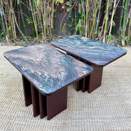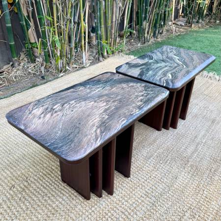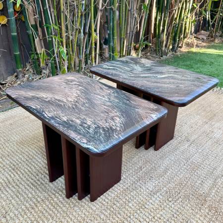 For sale is a stunning mid-century Danish Modern pair of end tables by Bendixen Design, Made in Denmark Circa 1970s. These impressive tables features mesmerizing, swirling rectangular marble top surfaces. The quality, color, and texture of the honed marble is outstanding, presenting a unique, one of a kind pattern on each table. The marble slabs rest on unique slatted rosewood bases of segmented oscillating lines. These rare and collectable vintage end tables/side tables are in superb condition.