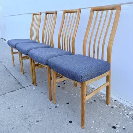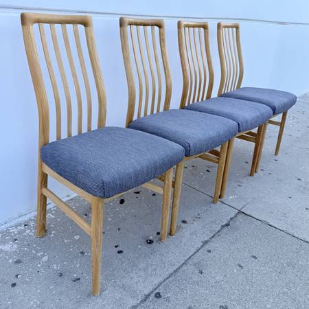 For sale is a fantastic set of 4 Mid-Century Danish Modern Dining Chairs in the manner of Kai Kristiansen for Schou Andersen. The light ash wood frames have an ergonomic bend that cradles the spine. The seats have been reupholstered in a textured slate fabric with new foam cushion. These vintage chairs are very comfortable, stylish and sit as good as new.