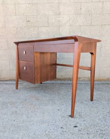 The Drexel Profile desk by John Van Koert is pure mid-century poetry. Walnut and pecan wood flow into gentle, organic curves, with signature flower-petal pulls revealing his jewelry design roots. More than a desk, it's a functional sculpture—boasting smart storage and a timeless, hardware-free silhouette. This is a collector's piece that defines an era. It is in great condition and ready to go!