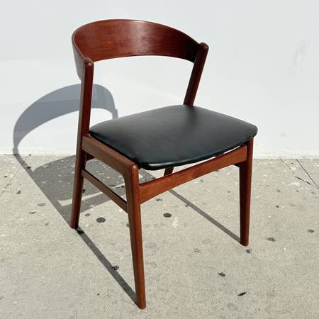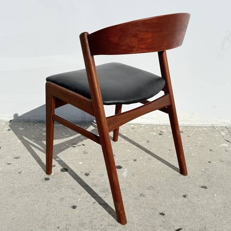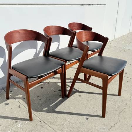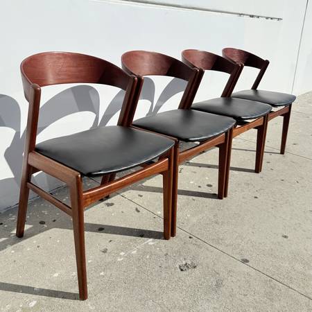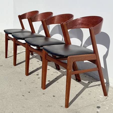 For sale is a stunning set of 4 Mid-Century Dining Chairs by Folke Ohlsson for DUX, made in Sweden circa 1960s. These iconic Scandinavian Modern chairs feature sculptural teak frames with a dramatic, curved wooden seat back that wraps like a ribbon around the sitter. The angled rear legs meet in contrast to the clean, squared profiles of the forward lines, giving the chair a dynamic stance. The original black naugahyde upholstered seats are clean and free from tears and blemishes. These classic and collectible dining chairs will add a beautiful vintage accent to your dining area and are in excellent vintage condition.