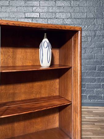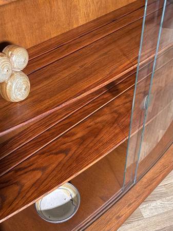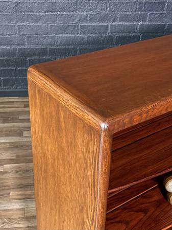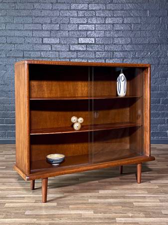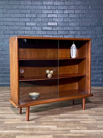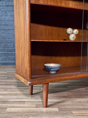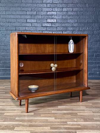 This Mid-Century Modern bow front bookcase credenza showcases a beautifully curved façade with sliding glass doors that glide effortlessly across its freshly refinished surface. Crafted from solid oak and stained in a rich walnut tone, it offers the warm depth of walnut grain with the durable structure of American hardwood. Two wide interior shelves provide generous display space for books, ceramics, or vinyl, framed by softly rounded edges that highlight the era’s affinity for sculptural simplicity. Sleek understated pulls carved directly into the glass maintain a clean, minimalist profile while adding a touch of sophistication. A versatile piece that can function as a media console, display cabinet, or dining room server—elevating any space with its timeless charm.