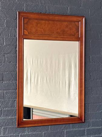 This Mid-Century Modern wall mirror from the 1960s showcases a beautifully crafted cherry wood frame with clean lines and subtle detailing that highlight its timeless design. The warm tone of the cherry wood adds richness and character, while the upper panel features decorative quarter-circle inlays that bring an elegant touch to the piece. Retaining its original mirror, it reflects both quality and authenticity, making it a versatile addition to a variety of interiors. Ideal for an entryway, bedroom, or living space, this mirror combines functionality with understated sophistication.