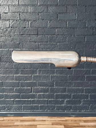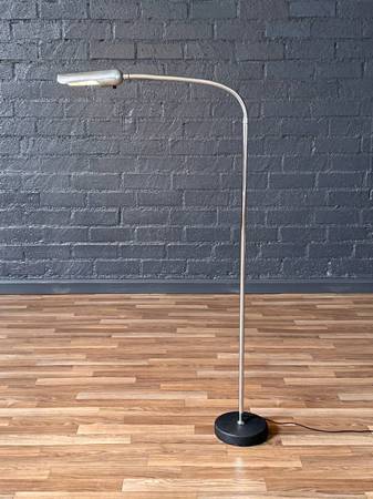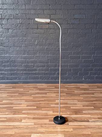 Sleek and minimal, this Mid-Century Modern gooseneck floor lamp from the 1970s brings both form and function into perfect balance. Crafted with a chrome body and a sturdy iron base, its flexible neck allows for precise lighting—ideal for reading or focused tasks. The sculptural head and industrial details give it a timeless aesthetic that complements modern and vintage interiors alike. Its clean lines and durable materials reflect the practical elegance of American design from the era. The lamp is in original vintage condition, showcasing light patina consistent with age and use.