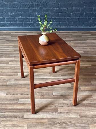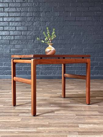 This expertly refinished Mid-Century Modern floating top side table by Gunlocke Chair Co. Inc., c.1960’s, showcases the company’s mastery in crafting functional furniture with refined simplicity. Built in solid walnut, the table highlights clean lines and subtle rounded edges that reflect the design ethos of the era. The floating top construction adds a sense of lightness, making it both a versatile and elegant piece suitable for a variety of interiors. Its understated form allows the natural wood grain to take center stage, embodying the timeless appeal of American mid-century craftsmanship.