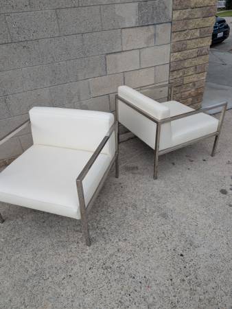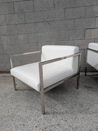 ✨ Get cozy with these vintage lounge chairs! This set features an aluminum frame and crisp white bonded leather, perfect for any room or setting. In great vintage condition and available now!