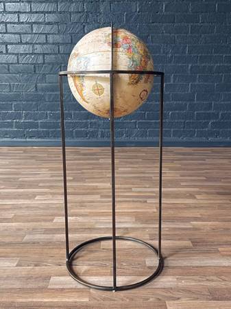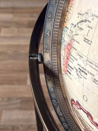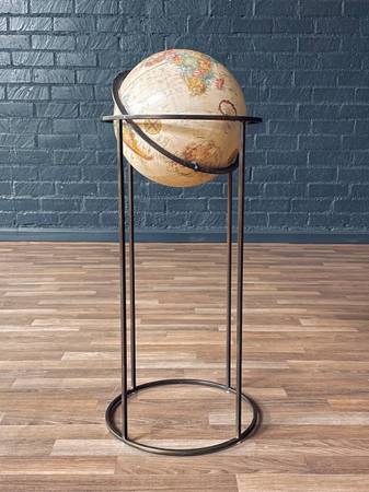 This Mid-Century Modern Replogle floor globe from the 1970s pairs a clean, minimalist brass stand with a richly detailed cartographic sphere. The globe was designed under the direction of LeRoy M. Tolman, Replogle’s chief cartographer from the 1950s through the 1980s, whose work defined much of the way Americans visualized the world during the Cold War era. Its geographic details date it between 1971 and 1980, a fascinating moment when countries like Zaire and Rhodesia still appeared on maps before later independence movements reshaped borders. The slender tubular frame reflects the era’s design ethos—functional, geometric, and stylishly understated. As both an educational object and a design statement, this piece captures the intersection of modernist aesthetics and mid-20th-century world history.