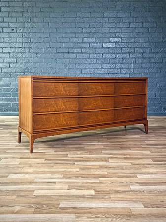 This expertly refinished Mid-Century Modern “Rhythm” dresser by Lane showcases the timeless elegance of 1960s American design. Crafted from rich walnut, the piece features nine spacious drawers with sculpted pulls that blend seamlessly into the sleek facade. The tapered legs and beveled edges highlight Lane’s signature craftsmanship and attention to detail. A warm, hand-applied finish enhances the natural wood grain, giving the dresser a sophisticated yet organic feel. Both functional and stylish, it’s a striking storage solution for any modern interior.