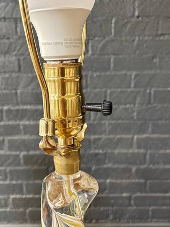 This Mid-Century Modern twisted crystal glass table lamp, dating to the 1960s, embodies elegance and sculptural beauty. Its fluid, twisted glass form creates a striking visual effect, refracting light in a mesmerizing way. Complemented by a newly added shade and rewired for modern use, this lamp seamlessly blends vintage charm with contemporary functionality. The refined brass hardware adds warmth to the design, making it a versatile statement piece for any interior. A perfect balance of sophistication and artistry.