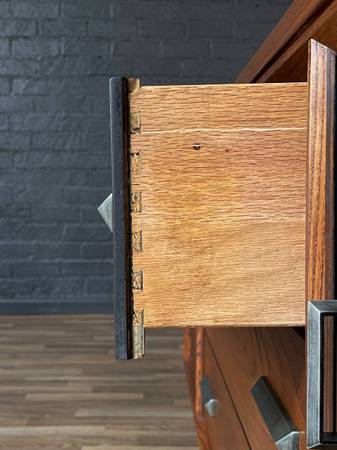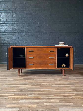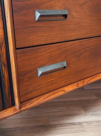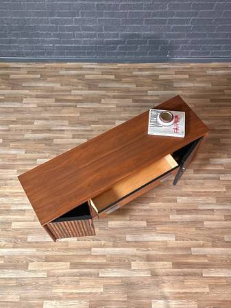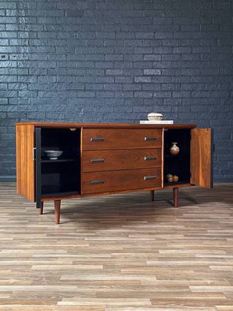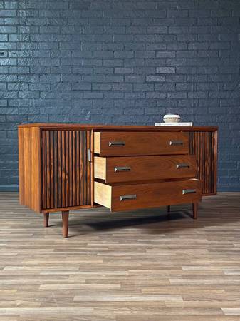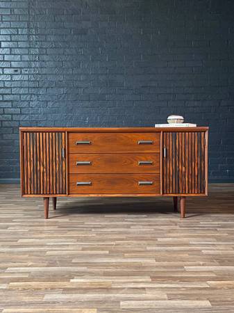 This Mid-Century Modern credenza by Bassett Furniture, crafted in the 1960s, showcases a striking combination of walnut and rosewood with sleek metal pulls. The design features three spacious drawers flanked by cabinet doors with bold, sculpted vertical details, offering both style and functionality. Its clean lines, tapered legs, and rich wood grain reflect the timeless elegance of American modernism. Expertly refinished to preserve its original beauty, this piece is perfect for use as a credenza, media console, or statement storage unit. A true example of Bassett’s craftsmanship, this credenza brings sophistication and practicality to any space.