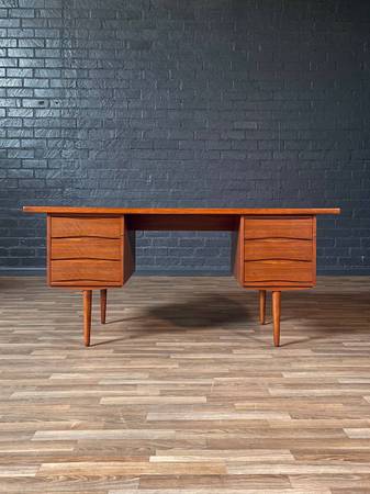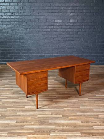 This stunning Mid-Century Modern executive desk by Fredrik Kayser for Skeie & Co., crafted in Norway in the 1960s, is a masterclass in Scandinavian elegance and craftsmanship. Made from richly grained walnut, the desk features two banks of drawers with sculpted, recessed pulls and tapered legs that showcase Kayser’s clean, architectural lines. The generously sized top offers ample workspace while maintaining a refined, minimalist silhouette. Every detail has been carefully preserved and professionally refinished, bringing the wood’s natural warmth and beauty back to life. A timeless piece that brings both functionality and sophistication to any office or studio.