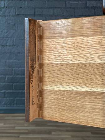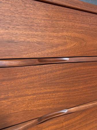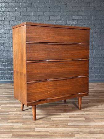 This expertly refinished walnut dresser by Harmony House blends refined craftsmanship with sleek Mid-Century Modern styling. Featuring sculpted integrated drawer pulls and richly grained wood, it’s both functional and visually striking. The dresser’s balanced proportions and rounded, tapered legs offer subtle design details that give it a sculptural presence from every angle. Part of the charm lies in its clean lines and minimalist form—offering a timeless piece that feels just as fresh today as it did in the 1960s. Whether in a bedroom or a modern living space, this piece is a versatile and elegant storage solution.