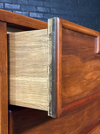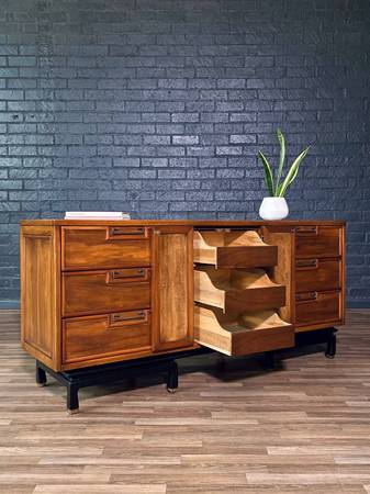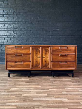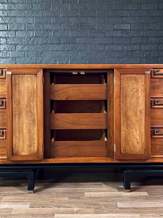 This expertly refinished Mid-Century Modern dresser by American of Martinsville, c.1950’s, beautifully blends clean lines with subtle Chinoiserie influence. Crafted from rich walnut, it features a striking ebonized base, brass hardware, and sculpted details that highlight the elegance of its form. The dresser offers generous storage with six spacious drawers and a central cabinet fitted with three hidden pull-out drawers, making it both functional and sophisticated. Its warm walnut grain and refined craftsmanship make it a timeless statement piece for any interior. A true example of American design ingenuity, it seamlessly combines style and practicality.
