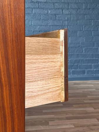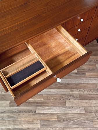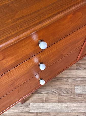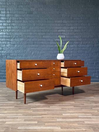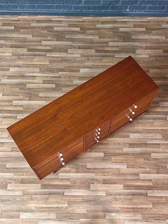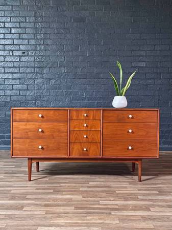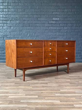This expertly refinished Mid-Century Modern “Declaration” dresser by Kipp Stewart for Drexel showcases timeless design and superb craftsmanship. Constructed in rich walnut, the piece features nine spacious drawers accented with its original white porcelain pulls, creating a striking contrast that highlights its clean lines. The dresser rests on tapered legs, reflecting the elegant simplicity and functionality that defined the 1950s era. With its blend of warm wood tones and refined details, it offers both style and practicality for modern interiors. A true statement of American mid-century design, this piece remains as functional today as when it was first introduced.