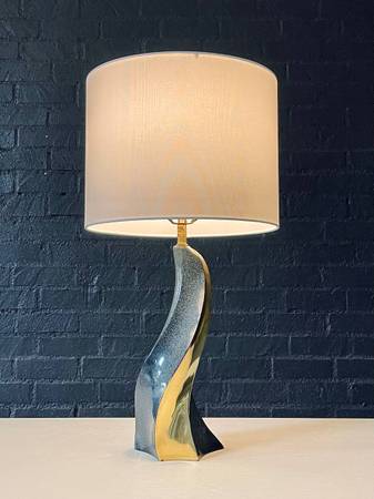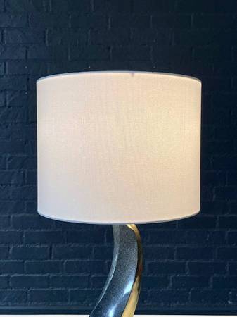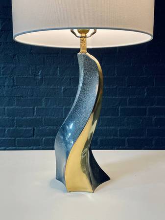 This sculptural table lamp strikes an architectural pose with its twisted, ribbon-like form that rises in a graceful spiral. One side reveals polished brass that catches the light, while the opposite surface features a faux-stone glazed finish that mimics ceramic or marble over metal—an unusually rare combination that gives the piece a dual-material presence. The flowing silhouette feels both modern and organic, almost like a mid-century interpretation of movement frozen in time. Paired with a new custom linen shade, the lamp glows softly and emphasizes the curves and shadows of its twisting base. It’s a statement piece that reads like art as much as illumination.