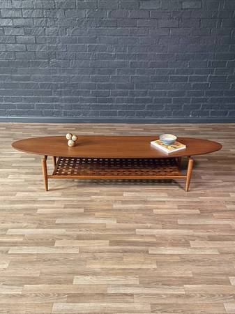 This stunning surfboard-style coffee table by Lane epitomizes the sleek, organic lines of mid-century American design. Crafted in the 1960s from rich walnut with an elm wood base, it features an elongated oval top that appears to float gracefully above a woven lower shelf, combining elegance with practical storage. The sculpted tapered legs and signature Lane craftsmanship highlight the brandβs dedication to form, balance, and enduring quality. Expertly refinished, the piece showcases a silky smooth surface and beautifully preserved grain, making it a timeless centerpiece for any modern living space.