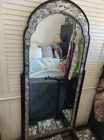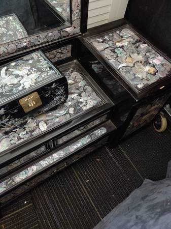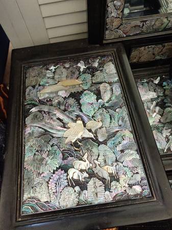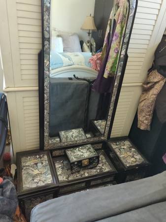 Reduced from $600 to $450. A rare beautiful mother of pearls vintage vanity with inlaid abalone mother of pearls. A statement piece, depicting beautiful natural motifs of birds, peacocks, flowers, and trees, evoking in its serenity a sense of tranquility and calmness. A rare beautifulpiece, showcasing a high end artistic craftsmanship at its finest.