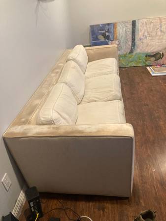 I'm moving and I need to get rid of this couch I bought at an estate sale a while back. Its quite nice, old, comfy, and large.!It has some stains on the pillows but they can be washed or covered. Free to anyone who can take it. Let me know if you have any questions.