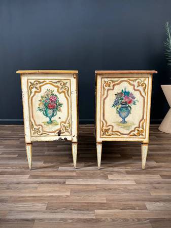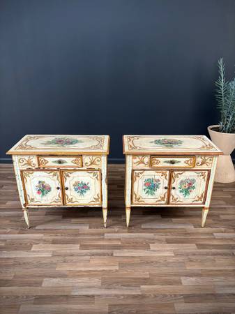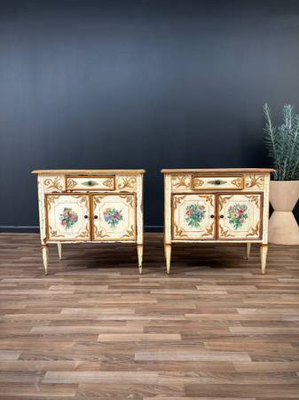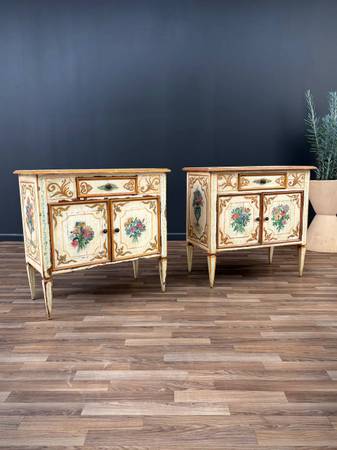 Pair of Italian Neoclassical Style Hand Painted Night Stands Cabinets, c.1950’s $1,895 pair - Original Vintage Condition Dimensions: 31”H x 32”W x 17.50”D Local Delivery Is Available 👉...