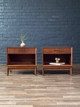 This pair of Mid-Century Modern nightstands by Drexel embodies the clean sophistication and practicality of 1960’s American design. Crafted in walnut with rich tones and striking grain, each nightstand features a single drawer with dovetail joinery, accented by patinated brass handles, and an open bookcase compartment beneath for added function. Raised on tapered legs, the design feels both light and architectural, offering timeless versatility for the bedroom or living space. Expertly refinished in our Los Angeles studio, these pieces have been carefully restored to showcase their beauty while maintaining their original character. Durable, elegant, and understated, they are an ideal blend of form and function.