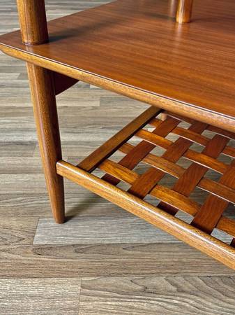 side tables by Lane beautifully showcases the brand’s signature blend of form and function. Each table features a newly refinished walnut top with a sculpted edge resting above a solid elm base finished in a rich walnut stain, accentuating the natural warmth and grain of the wood. The lower tier includes Lane’s iconic woven slat shelf, offering both visual texture and practical storage. Designed with clean lines and organic contours, these tables embody the timeless elegance of 1960s American modern design. Their balanced proportions make them a perfect fit for both living and bedroom settings.