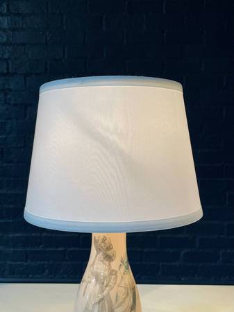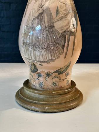This charming pair of Hollywood Regency ceramic table lamps captures the elegance and whimsy of mid-century décor with a romantic nod to Rococo-era fashion. Each lamp features delicately glazed ceramic bases adorned with detailed illustrations of aristocratic women in 18th- and 19th-century attire, reminiscent of vintage fashion plates. The soft blush tones and floral accents are complemented by distressed wooden bases, adding a touch of rustic character to their refined silhouettes. Recently rewired and fitted with new shades, these lamps are ready to enhance their nostalgic appeal. A graceful blend of history and Hollywood glamor, they’re perfect for adding vintage charm to any interior.