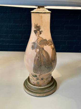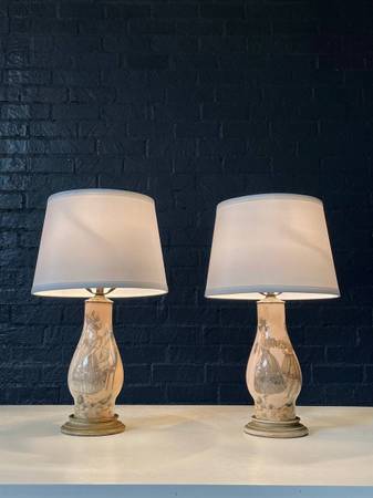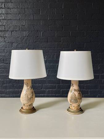 Pair of Vintage Hollywood Regency Ceramic Table Lamps w/ Rococo Fashion Illustrations, c.1950s