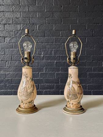 Fun Historical Fact: Rococo fashion, known for its lavish ornamentation and elaborate hairstyles, flourished in 18th-century France and influenced decorative arts well into the 20th century—including whimsical pieces like these mid-century lamps.