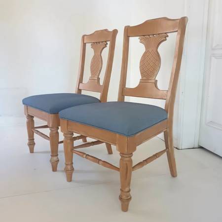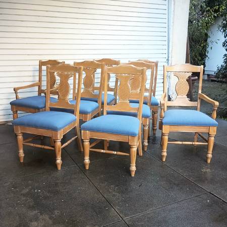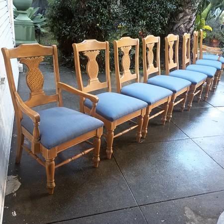 Hi, I am selling a set of dining chairs. This 8 dining chairs are from the 90s, 6 single and two with arms. They are custom made with pine wood and have the original blue fabric on them. They have a simple clean lines design with a carved pineapple design on their back. They have a natural wood finish color and a couple wine stains on the fabric on two of them. They are strong, compact and complete, and very comfortable.