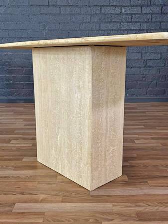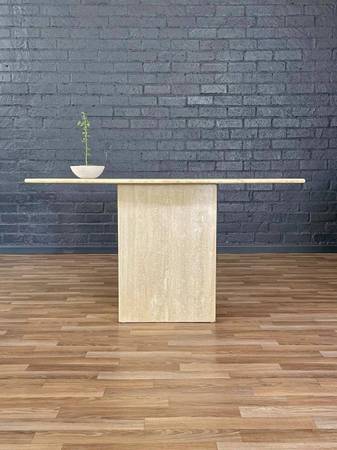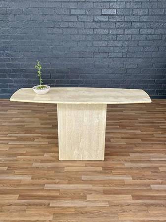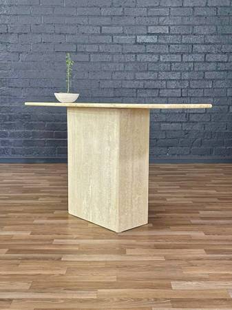 Crafted in Italy during the 1980s, this Post Modern console table features clean, architectural lines in natural travertine. The elongated top rests on a monolithic base, creating a balanced and sculptural presence. Its soft, neutral tones and subtle veining highlight the organic beauty of the stone. Minimal yet refined, it’s a timeless piece that works effortlessly in both modern and transitional spaces. The table remains in original vintage condition with light wear consistent with age.