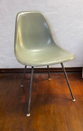 Vintage Charles and Ray Eames molded fiberglass side chairs: one is dark sea foam green, the other is a dark coffee color.